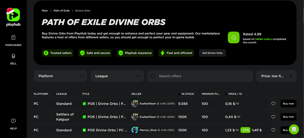 Best prices due to competition. The main law of the market: the more sellers, the lower the price. On Playhub, you can almost always find an offer cheaper than on fixed platforms. Sellers see competitors’ prices and lower theirs by 1-2 cents to rank higher. For a buyer planning to purchase a large quantity of Divine Orbs for crafting top-tier gear, this difference can be significant.